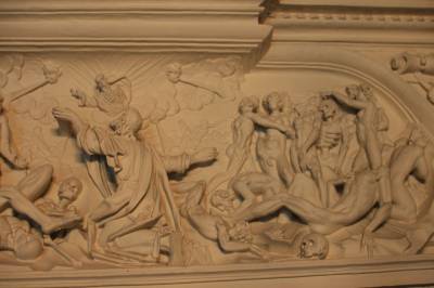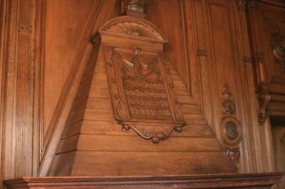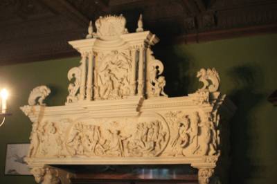 Einer unserer vielen Innenräume schmückt ein 4 m hoher und 2,5 m breiter, aus dem frühen 17. Jahrhundert stammender, prunkvoller Kamin mit Bibelmotiven.