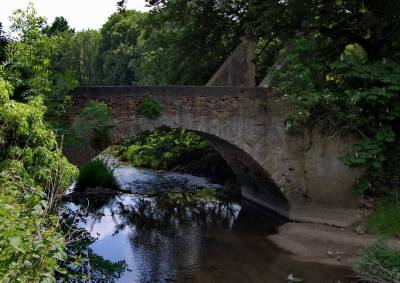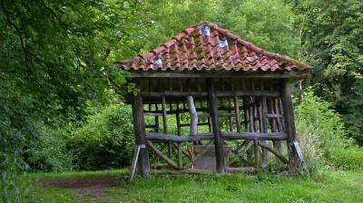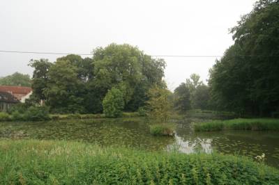 Drei Lilienblätter mit goldener Kugel. Sie erinnern sich vielleicht, wo Sie dieses Wappen schon mal gesehen haben. Auf der Rückseite des Schlosses befindet sich die 1804 erbaute Mühle.