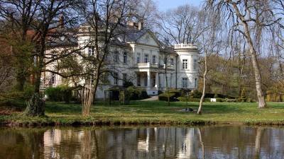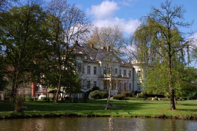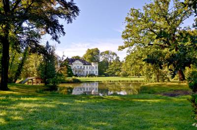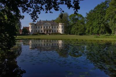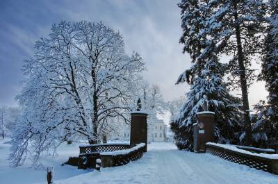 Nachdem das Hauptgebäude Anfang des 19. Jahrhunderts abbrannte, errichteten wir 1838 das heutige Schloss im Empire-Stil an dieser Stelle. Vielleicht sind Ihnen schon die markanten Ecktürme aufgefallen. Im Giebel, der das Hauptportal schmückt, sieht man unser Familienwappen, schauen Sie genau hin.