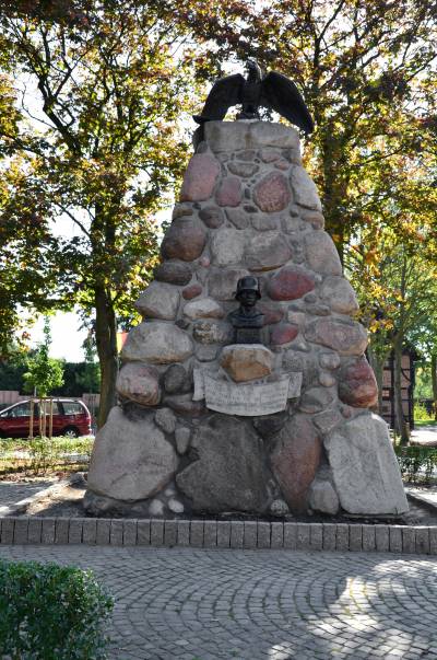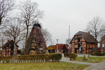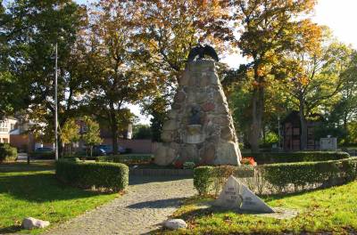 Nebenbei bemerkt, auch ich hatte meine Pflicht beim Militär zu leisten und war 1866 preußischer Kürassier-Offizier. Damit dieses Denkmal über viele Jahrzehnte stehen bleibt, wurde es massiv aus Findlingen, Steinplatten und Gusseisen gebaut. Auf der Spitze sitzt ein gusseiserner Adler mit gebeugten Flügeln, der damals das wieder erhebende Vaterland symbolisieren soll. Auf der Vorderseite ist eine gusseiserne Soldatenbüste mit Aufschrift angebracht, die eine jederzeitige Bereitschaft fürs Vaterland verdeutlichen soll.
