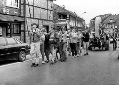 Natürlich durfte ich als Toller Bomberg mit der Eisenbahn nicht fehlen. Wenn wir uns am Bahnhof einmal begegnen, erfahren Sie auch warum. Aber neben mir wurde auch die Hassel, eine hölzerne dicke Scheibe abgebildet. Ohne sie gäbe es kein traditionelles Osterhasseln auf der Nottulner Straße im Dorf. Dieses spektakuläre Ereignis kann ich Ihnen aber besser dort vor Ort erzählen.
