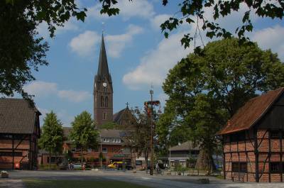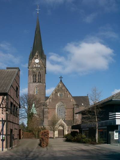 „Sie stehen auf dem Kirchplatz vor der neuen St. Pankratius Kirche, die sich vor Ihnen erhebt. 1904 wurde auf Grund und Boden der Familie von Romberg mit dem Bau dieser großen Kirche begonnen.