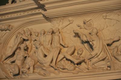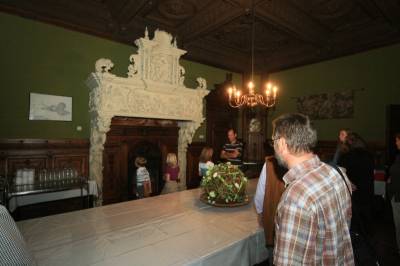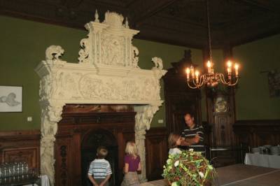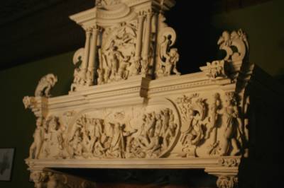 Einer unserer vielen Innenräume schmückt ein 4 m hoher und 2,5 m breiter, aus dem frühen 17. Jahrhundert stammender, prunkvoller Kamin mit Bibelmotiven.